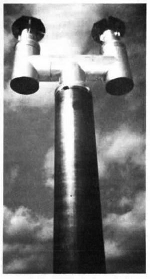 An 8-in. to 6-in. reducer goes on top of the pipe. A 6-in. cross pipe is fitted with two short 6-in. vertical pipes that are open on either end. The vertical pipes are tilted slightly inward toward each other to create a great than 90? bend, making it more difficult for wind to find its way down the stack. A 6-in. to 4-in. reducer mounts on top each short pipe, topped by 4-in. chimney caps.