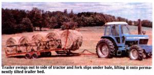 The bale hauler is fitted with a hydraulically-controlled swing away tongue that swings out to the side of the tractor to pick up bales and then swings back behind the tractor for transport. An up-front bale fork slips under the bale and lifts it onto the trailer bed which is permanently tilted to the rear. Wien the fork gets it onto the table, the bale rolls back to either the rear gate or against already loaded bales.