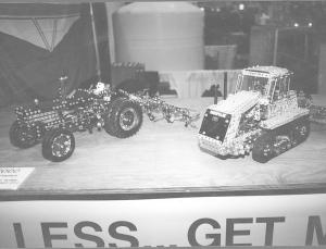 On a recent visit to the U.S. he displayed a pair of his "erector set" tractors and implements at the National Farm Machinery Show in Louisville, Kty., including a Ford 7000 tractor pulling a ptodriven rotary tedder and a Challenger 65 pulling a pto-driven harrow. Each tractor is powered by a 12-volt electric motor (the Challenger has two) that allows the tractor to move forward or backward and to turn. The motor also operates the 3-pt. hitch and pto, allowing the implements to work just like the real thing.