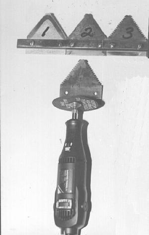 "To use, you simply make 1/8-in. deep cuts into the sides of the dull blade, skipping two or three of the original serrations between cuts. It takes only a minute or two per blade and two cutting disks should take care of a 24-ft. sickle bar. The easiest way to sharpen the blades is to remove the sickle bar from the header. However, you can leave the sickle bar in place to do the job. You can cut into two blades at a time. No need to unbolt the blades.