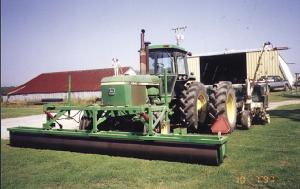 "It rolls flat on the ground and does an outstanding job of firming up sandy soils and flattening clods in clay soils," says Roberts. "Several farmers in my area mount 12-in. dia. rollers in front of their grain drills, but my roller is too heavy for my tractor to lift the additional weight on back. One problem with a roller mounted in front of a grain drill is that it doesn't have any way of flexing whereas my front-mounted roller flexes up or down independent of the drill. It works better than pulling a roller behind a disk or chisel plow because it doesn't build up with dirt from the freshly turned soil. The roller runs in dry soil all the time so it stays clean and shiny.