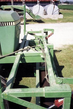 Roberts pushes the roller ahead of his Deere 4840 tractor as he plants wheat or soy-beans with his 20-ft. grain drill. The 18-in. dia. roller mounts on a steel frame that bolts to the sides of the tractor and is raised or lowered by a pair of hydraulic cylinders. The front part of the frame is hinged, allowing the roller to be adjusted for downpressure. A set of suitcase weights helps apply down pressure.