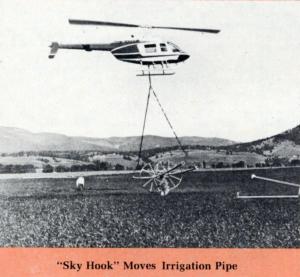 Developed by Rambling Rotors, a commercial helicopter operation in LaGrande Or., the technique calls for the pilot to hover the aircraft a few feet above two sections of pipe while his ground crew places specially designed hooks on to the pipe. The helicopter (in this case, a Bell Jet Ranger) then lifts the pipe straight off the ground and deposits it at, the new site.