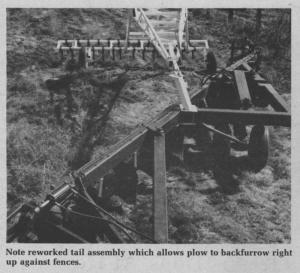 The reworked "tail wheel" assembly which allows close-up backfurrowing is available on 5 and 6 bottom Case 7000 series plows without adding the "flexing" feature. "In this procedure, we rebuild the tail end so it will backfurrow within an inch or two of a fence. The wheel base is shortened. For example, a six bottom plow will have the same wheelbase as a five bottom plow," Greg points out.