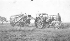 "My dad came up with this system in the early 1900's. It allowed him to cut and thresh grain at the same time just like the combines of today, but before they were widely available on the market. He was more than just a little ahead of his time," says Hausler. "The photo was taken some time between 1905 and 1910. My dad died in 1925 when I was four years old so I never saw his setup. I'm 78 and retired now. The photo is from the book "Trails Through Archer", a history written by Jack Loftin of some of the events that took place in Archer County, Texas, around the turn of the century.