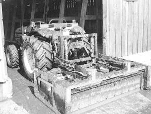 The Maxiscrape can be 3-pt. mounted on a tractor or attached to the front of a skid steer loader. It's equipped with two steel blades, one in front and one at the back. The blades have rubber squeegee edges that pivot into the scraper. As the operator backs up the tractor the weight of manure against the front blade causes it to angle backward, creating an open area along the floor where manure can enter the box. The rear blade remains vertical, trapping the manure inside the box.