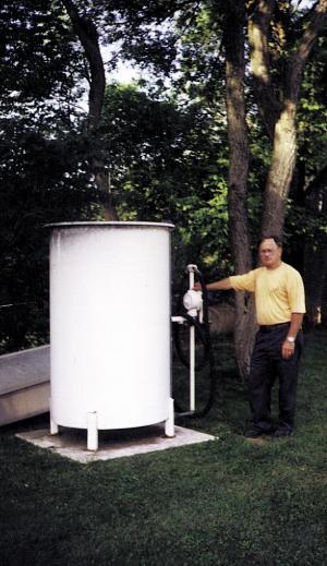 The tank is painted white to reflect heat. "The design dramatically reduces fuel loss. Evaporation only occurs in the 1/4-in. gap around the edge and in the 2-in. dia. fill pipe. "The fuel savings from using this tank will save me a considerable amount over the years."