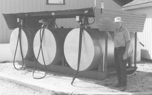 "We can just hook a chain to the skid and tow it away with a tractor," says Lorne. Each tank is equipped with an electric pump and hose. The pumps are turned on and off from a control panel in a nearby building. Underground wires connect the pumps to the control panel. "We always keep the power off except when fuel is being pumped into a tractor or vehicle. The wires are light enough that they'll break easily if we don't have time to cut them, and because the power would be off there wouldn't be any sparks," says Lorne.