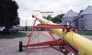 First is the automatic "Full Bin Alarm" mounted on my 60-ft. by 13-in. dia. grain auger. It consists of a device that hangs from the end of the auger in the bin and runs off the 12-volt battery on your tractor. When the bin gets full, a signal trigg