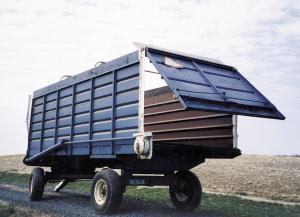 "We back the wagon to the silo, hook up the pto to the tractor, and engage," says Clark. "The rear gate opens automatically and the load is discharged in a few seconds. This modification is so ideal for bunker silos we converted an old side-discharge New Holland wooden silage wagon to rear discharge the same way. It held 5 tons originally and now holds 8 tons easy."
