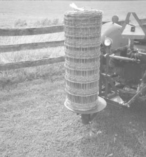 It's made from a piece of 4-in. dia. pipe and two 20-in. round steel plates û one bolted down and one left free to turn with the wire as the tractor goes along. In places where the tractor can't go, you can easily pull the wire off the unroller by hand.