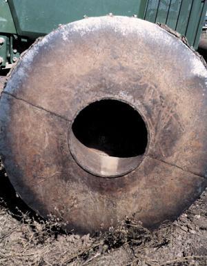 His homemade wheels measure 5 ft. high on back and 3 ft. high on front. Each wheel is 12 in. wide at the center but tapers out to only a 2 1/2-in. width at the rim. The wheels make V-shaped, 4 to 6-in. deep ditches that disturb very little soil, allowing Easley to use the tractor right after seeding without doing significant damage to crops.