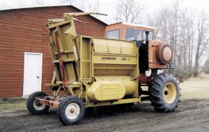 Like many livestock producers, Denis Brenneis of Morinville, Alberta, thinks big bale shredders are one of the best time and labor savers on the farm. He made his Haybuster 256 shredder even more handy by mounting it on the frame of a Massey 410 combine.