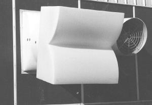 The one-piece poly unit bolts over the end of any existing ventilation fan. It's open at the top and bottom, with the front and both sides closed. The unit separates the air flow coming out of the fan so that part of it goes out the top and the rest out the bottom.