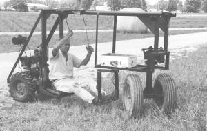 The picker is powered by an electric start, 3 1/2 hp Briggs & Stratton gas engine mounted on back and has three speeds forward and one reverse. Gears are shifted with an overhead connecting linkage. The clutch is centrifugal, so the amount of acceleration applied regulates travel speed. The rig steers electronically via a toggle switch. Pushing the switch one way steers the rig to the left, and pushing the switch the other way steers it to the right. A small electric motor drives a small sprocket which in turn actuates a larger sprocket via a link chain to turn the front wheels. Both the front and back wheels are spaced 28 in. apart.