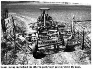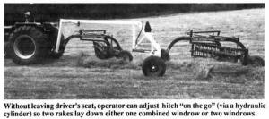 Without leaving the driver's seat, the operator can control the hitch "on the go" (via a 2 by 18 in. hydraulic cylinder) so the two rakes lay down one combined wind-row, or two windrows. Positioning the rakes to track in alignment for going through gates, or down the road, is also done right from the tractor seat.