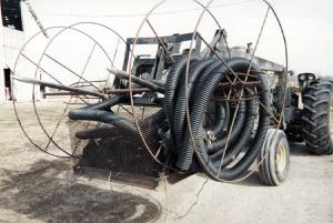We made tile carriers out of a pair of big 6-ft. dia. steel reels. The reels are connected together by a long steel pipe that mounts over the bale loader on my front-end loader. We made a metal framework for each reel to connect it to the pipe. With two reels we can carry two different sizes of tile. For example, we can haul 150 ft. of 6-in. tile on one reel and 250 ft. of 4-in. tile on the other reel. The reels are supported by steel I-beams originally used by phone or electric companies to support large reels of cable. Each reel slips onto the pipe and is held on with a piece of chain.