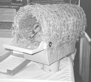 Another popular model is the "Duck Den", which looks somewhat like a mailbox. It measures 2 ft. long and 12 in. in dia. and weighs about 15 lbs. It's covered with flax straw that's held in place by metal webbing.
