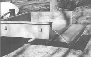 He used 1/8-in. thick steel to make a 4-ft. sq. box with 12-in. high sides and a tailgate on back. The bottom center part of the box hinges on a pair of 1 1/2-in. wide steel arms welded to a triangle-shaped bracket that mounts on the 3-pt. Walsh welded a pair of angle irons to the bottom side of the box, one on each side. A pair of 3/4-in. bolts run through the angle irons to form the hinge points.