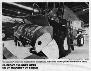 Operating speeds and cleaning capacity are boosted by the new design. The up-front 8¢-ft. long cleaning separator mounts on the feederhouse directly behind the cutterbar. Most of the straw is removed by the cylinder and dropped in a windrow along the left side of the header.