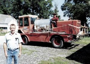 I converted a salvaged fire engine truck into a 4-WD self-propelled field sprayer. It looks a little odd going through the field, but it works. The truck is powered by a 6-cyl. Caterpillar engine that's mounted at the rear and has a 4-speed automatic transmission. It originally had a big, clumsy 6-passenger cab which I