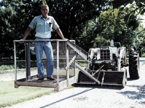My brother Jim and I built a loader-mounted cherry picker for use around our farm. Safety was the first consideration in building it. The main arm that supports the picker is made from 4 by 4 box steel and has a T-shaped base at the bottom end that fits across the width of the loader bucket. Chains with tighteners hold the arm absolutely solid against the bucket. We used scrap iron to build the picker cage, which is about 4 ft. wide and deep and 3 1/2 ft. high. The cage fits inside a steel frame and is self leveling. Once the working height is reached, the person inside the bucket uses a notched bar to lock the cage in place so it can't swing.