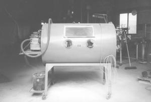 Kirkland cut the tank stand's legs down to 2 ft. and fitted them with caster wheels. A 1 by 2-ft. window was cut into one side along with a pair of 7-in. dia. access holes, spaced 16 in. apart. He fitted the holes with lengths of inner tubing to act as protective gloves.