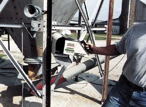 A mailbox bolted to one of the legs on our 500-bu. hopper bottom grain bin serves as a handy place to keep our grain moisture tester. Grain is delivered from a dryer into the bin. It's unloaded out an auger at the bottom of the bin and into a grain cleaner. From there it's pneumatically delivered into a 10,000-bu. bin