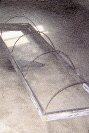 This mini greenhouse is made from old hay rake tines. I made the frame from 1-in. angle iron, then welded the tines in place and bolted them to a 2 by 4 frame. That gives us something to which we can fasten the plastic. (Pete Peters, Box 166, Osler, Sask. S0K 3A0 Canada ph 306 239-2045)
