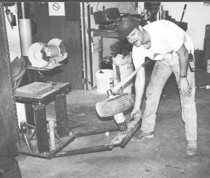 Lloyd Meffert, Hettick, Ill.: Lloyd built this foldup tire changer to conserve precious floor space in his shop. He uses it to repair all sizes of tires from lawn mower on up. He built a hinged frame that bolts to the base of his overhead crane. When he needs to work on a tire, he just folds it down.