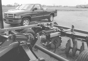 Glenn Buck of Vanceboro, N.C., owns a Taylor Way 14 1/2-ft. disk originally equipped with a manually-operated slide, designed to adjust the angle of the disk's two rear gangs. To make the job easier, he replaced the manually-operated slide with a home-built one powered by tractor hydraulics.