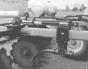 The disk's two rear gangs are each supported by a separate toolbar. The manually-operated slide was mounted on a length of steel beam that ran down the center of the disk. Buck removed the slide and made a new one out of two 3/4-in. thick, 16-in. sq. steel plates that bolt above and below the beam and attach to the end of each toolbar. A hydraulic cylinder anchored to the top of the beam moves the gangs back and forth as needed.