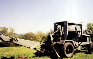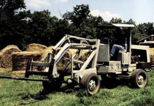 I made my own articulated round bale "forklift" using an old 2-ton truck frame and the front and rear axles off a Chevrolet 3/4-ton pickup. Power is provided by a 6.2-liter diesel engine, which is hooked to two transmissions - a 3-speed and a 4-speed - and a transfer case. The rig has a total of 16 forward speeds and 8