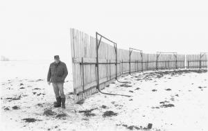Thompson found that a portable windbreak fence was the perfect solution for sheltering cattle on some rented range land during the winter. The cattle had been sheltered in aspen groves but browsed so much that the aspen trees were dying out. He tried using flax straw bales for windbreaks, but the cows ate them as well.