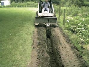 Rose's trenching tool attaches solidly to the loader bucket. It has skids on the side that allow him to precisely control the depth of the trench. He says in some cases, it's necessary to cut out the sod and then make another pass to cut the trench to the right depth. It will dig as deep as 2 ft. with several passes.