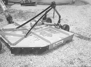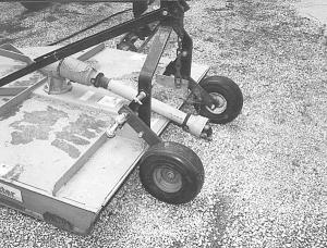 Robert Dunton, Topeka, Ill.: "The first thing I did when I bought my new 3-pt. mounted King Kutter mower was to mount a pair of 12-in. high gauge wheels on the front side. I use the mower along roadsides and right-of-ways. The gauge wheels keep the rig mowing evenly and prevent the deck from gouging the ground, which my landlord greatly appreciates. Each wheel is attached to the mower's 3-pt. bracket by a 1 by 3-in. flat metal bar. Deck height is controlled by adjusting a threaded rod with jamb nuts at each end. I set up my 8-ft. Bush Hog mower the same way, adding four gauge wheels on front of it.