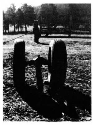 R.E. Vaughn, Jr., Huntsville, Ala., made a 2-wheel "unroller" that fits over the tip of his 3-pt. mounted bale spear. 'When I make a hundred or more bales, it often rains before I get them all into the barn and if they get a wet spot on the bottom, mold will grow there if I don't turn them up into the sun to dry off. I can roll over a hundred bales in a short time with these wheels. It takes only a minute to slide the wheels on over the spear and tighten down the bolt. I've used this idea for the past four year."