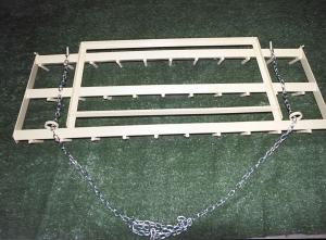 The secret to the rake's success is the way the chains hook to it. They run through loops at the front of the rake and fasten to pegs at the back so that they actually push the rake from behind, allowing the front end to float freely. If the rake hits an object, the front end simply lifts up and over without bouncing around a lot. Rocks up to 4 inches in diameter pass right through the rake without plugging it up. If bigger rocks are a problem, you can attach a rope to the back of the rake and pull on it on-the-go from the driver's seat to let the rock pass through. The same idea can be used if any tall weeds get caught in the rake.