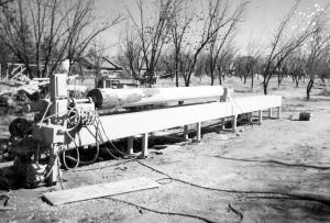 Green uses his log lathe to turn down logs to a uniform diameter for building houses.
