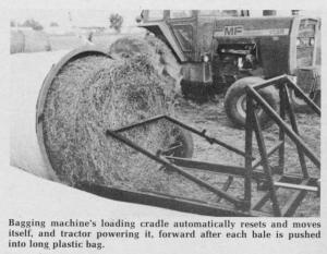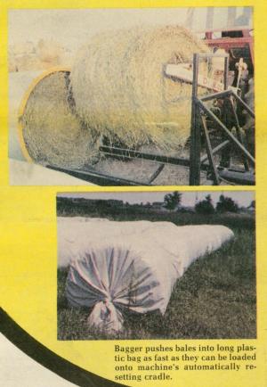 The revolutionary bagger for big round bales, invented and patented by Good, who heads his own AgriMarketing/Development Co., allows one man, working alone with a tractor and bale fork or loader, to "stuff" big round bales into long sausage-like plastic bags. (The machine is patterned after the "Max Pac," first featured in FARM SHOW two years ago, which stuffs conventional chopped silage and haylage into long plastic bags.)