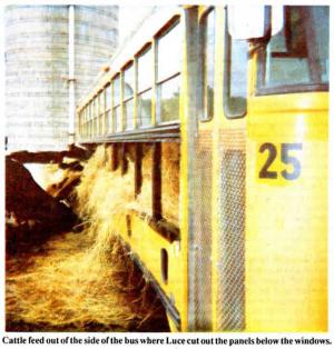 To convert the bus to a feeder, Luce simply cut out the side panels below the windows, leaving the vertical struts in place, and removed the seats. He also completely opened the rear end of the bus for loading bales. To load, he puts one bale inside the back of the bus and then pushes the bales ahead as he loads the rest of the bales into the bus. A swinging bar is closed across the rear opening once bales are loaded.