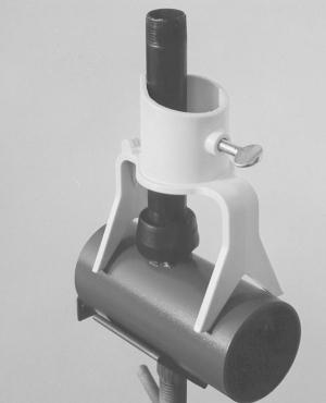 The tool is shaped like a small sawhorse. There's a 2-in. dia. opening in the middle, with a thumb screw on one side and a leveling bubble on the other side. You insert the fitting you want to weld through the opening and use the thumb screw to tighten it down. Then you adjust the jig as needed and make a couple of tach welds to hold it in place.