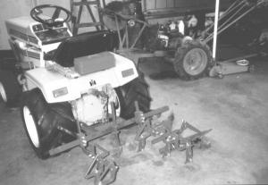 He modified an old 2-row horse-drawn cultivator so he can mount it on back of the tractor. The cultivator can be equipped with teeth of various lengths. A pair of center-mounted teeth are used to break up the ground for general purpose tillage work.