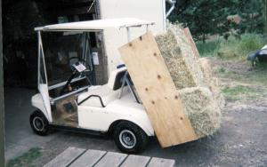 Used golf carts make excellent motorized feed carts for use in and around a stable or ranch. Joe Taylor of Philomath, Oregon, didn't want to spend the kind of money a Gator-type vehicle would have required, and his solution turned out to have several advantages.