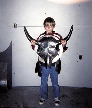 I started with a real skull in my shop and built the replica to scale, making the curved horns out of pipe. Then I framed the skull and covered it with sheet metal to make it three dimensional. A shield and four metal feathers gives the skull a life-like resemblance to the real thing. These pieces of art can be used inside or outside, and can be painted or left to corrode in a natural rustic state which seems to bring out an age-old sense of mystery and intrigued. (Joe Fitzgerald Saskatoon, Canada)