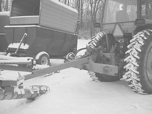 He built a 3-pt. mounted boom that does the work for him. It has a ball hitch receiver which attaches to balls Svendsen welded to each of his two augers. When hooked up, the boom holds the auger up, so the operator can use the tractor to maneuver the auger into position, and then slide the hopper under.