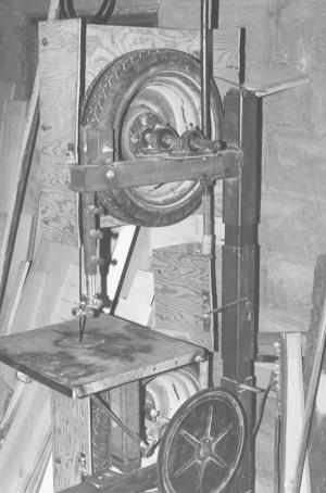 "I made this tire band saw out of two spare car tires. An electric motor belt-drives a pair of pulleys that turn a shaft that rotates the bottom tire. The saw blade runs from one tire to the other. My only expense was for the blade and the guide.