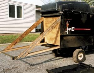 The unloader consists of a piece of plywood that fits against the front side of the cart. The board connects to a pair of 2 by 4's that extend the length of the cart's floor. A piece of pipe runs between the 2 by 4's and serves as a handle to pull the unloader out of the cart. The plywood board is reinforced by a pair of 10-in. wide boards set at an angle on each side.