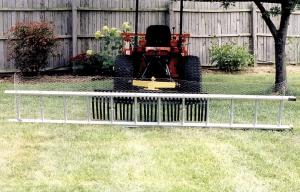 "It'll move a tremendous amount of leaves at a time," says Jay Main, Roanoke, Va., who rakes leaves with a 16-ft. wide section of an aluminum extension ladder that's covered with chicken wire and hooked on behind his 3-pt. mounted landscape rake.