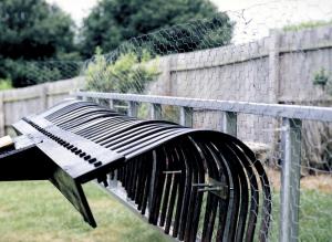 The ladder - which is actually a half section off a 32-ft. extension ladder - U-bolts onto the back side of the rake, and the chicken wire is tied to it with wire.